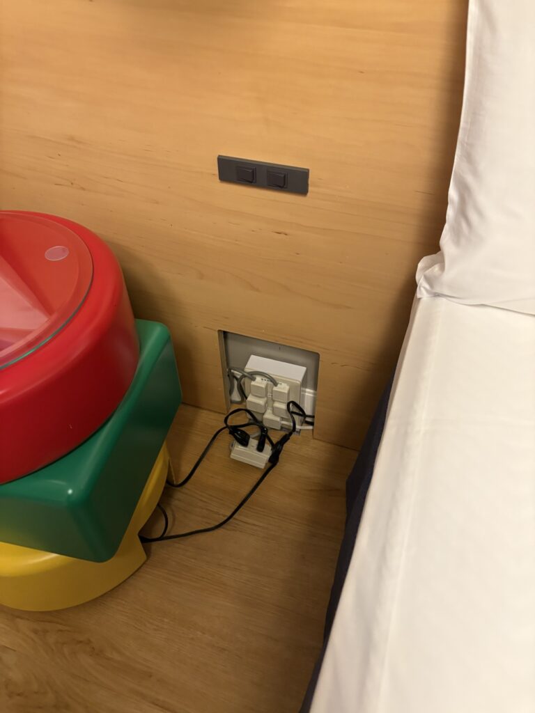 ツインベッドの間にあるテーブルの裏は配線があり、